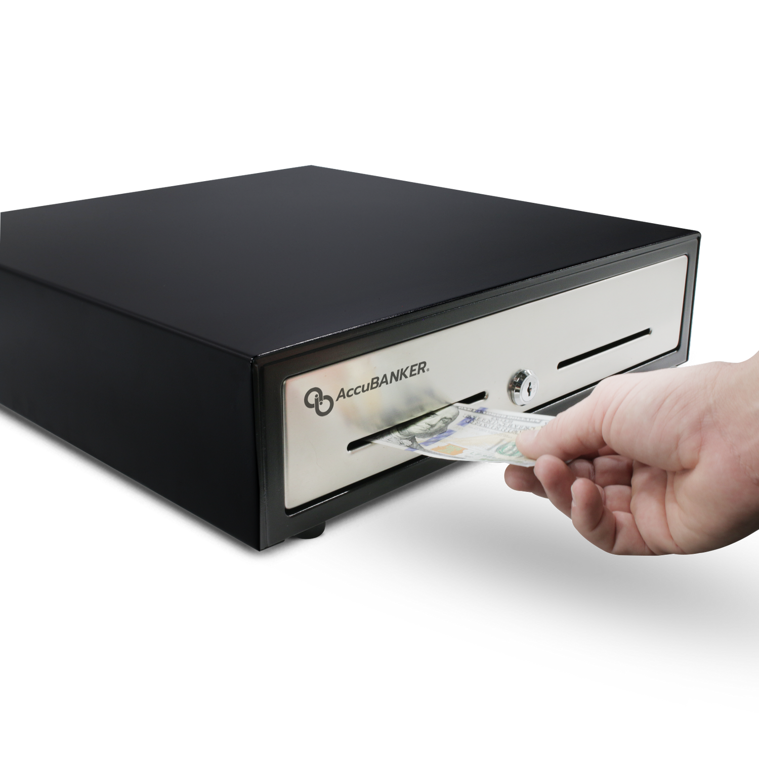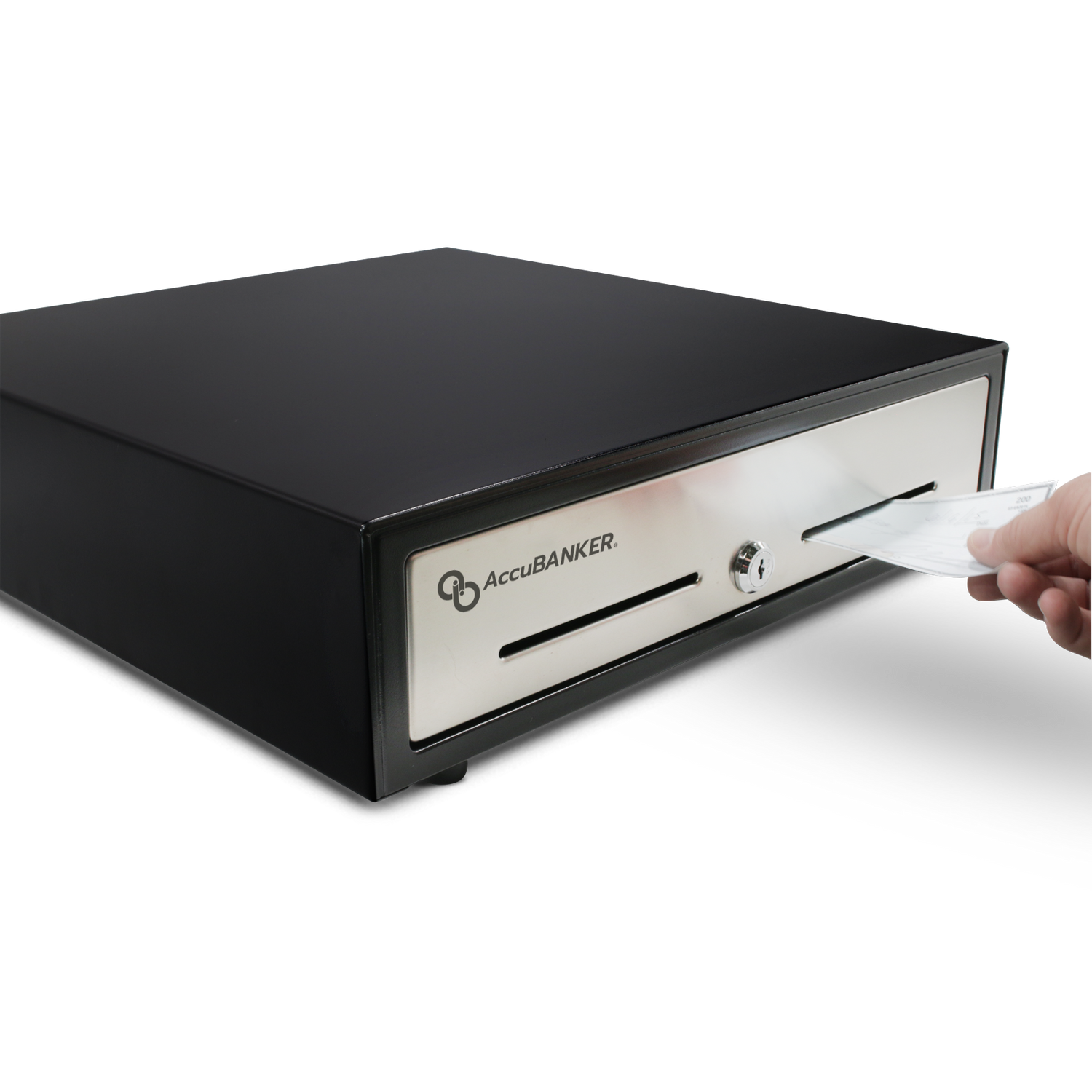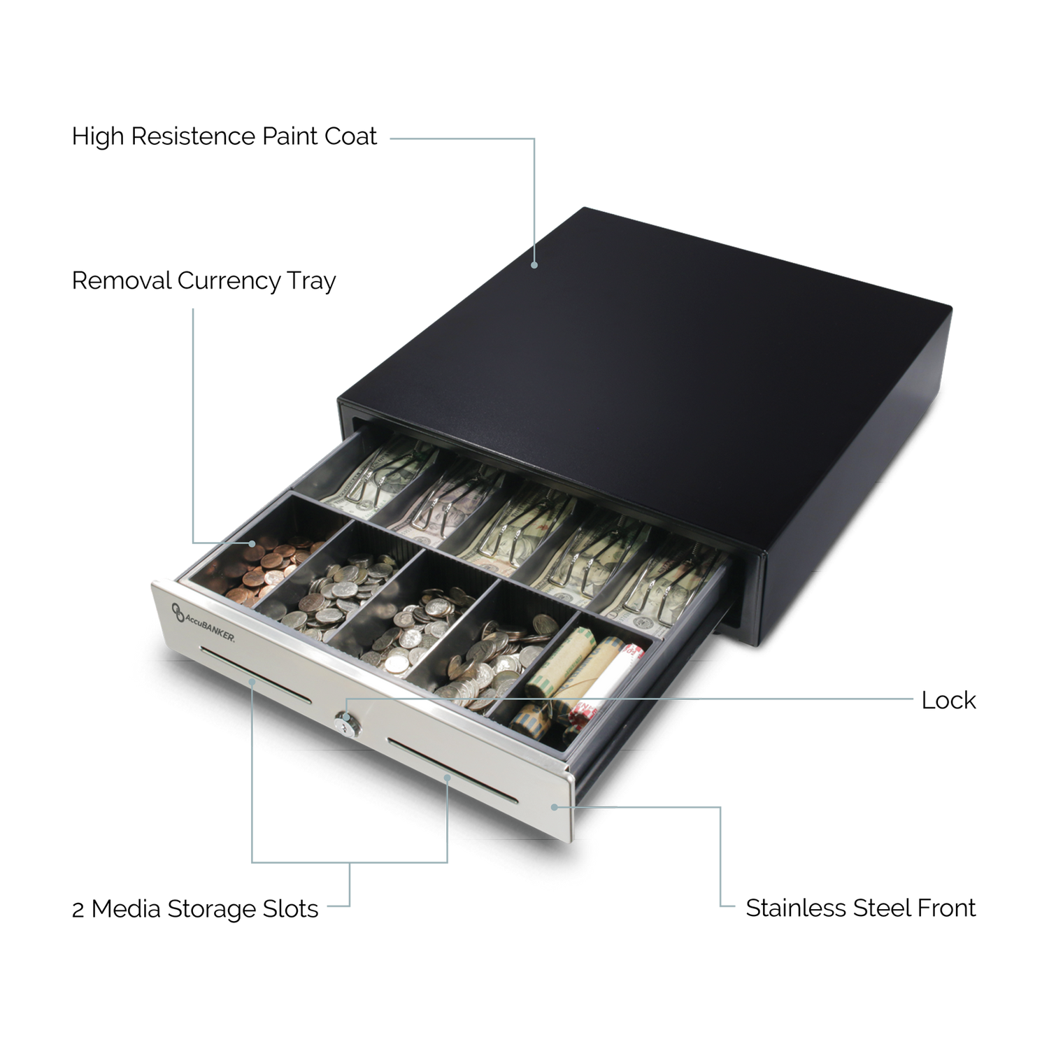 The AccuBANKER Iron Cash Drawer, with a high resistance paint coat and stainless-steel front, is a durable and robust POS solution for businesses. The currency tray is equipped with stainless-steel bill clamps to securely hold bills in place without damaging them. To demonstrate its performance and durability, the Iron Cash Drawer has been extensively tested to ensure easy interoperability.