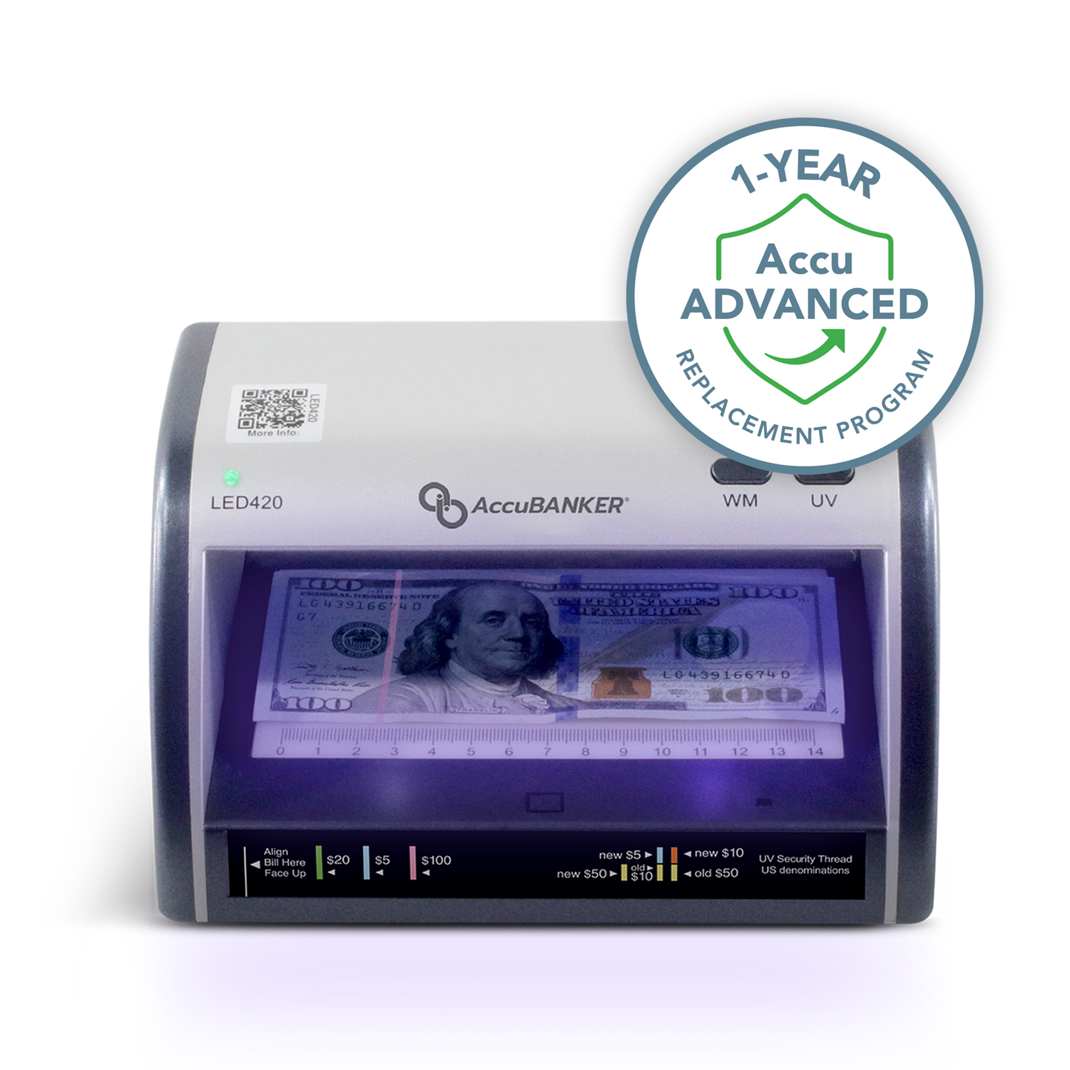 The AccuADVANCED 1-Year Replacement Program is available for all new AccuBANKER counterfeit detectors, counterfeit validators, and money counters, including coin counters, bill counters, value counters, and money scales.
