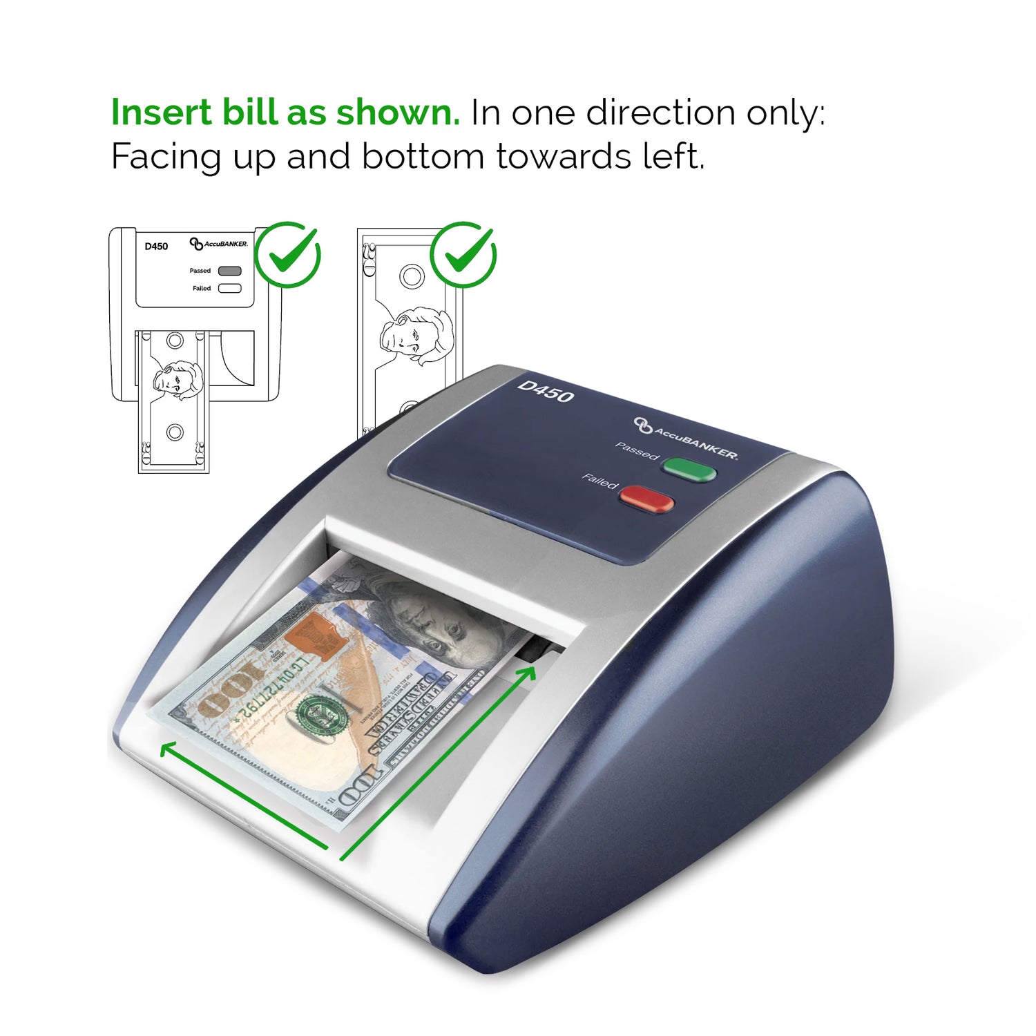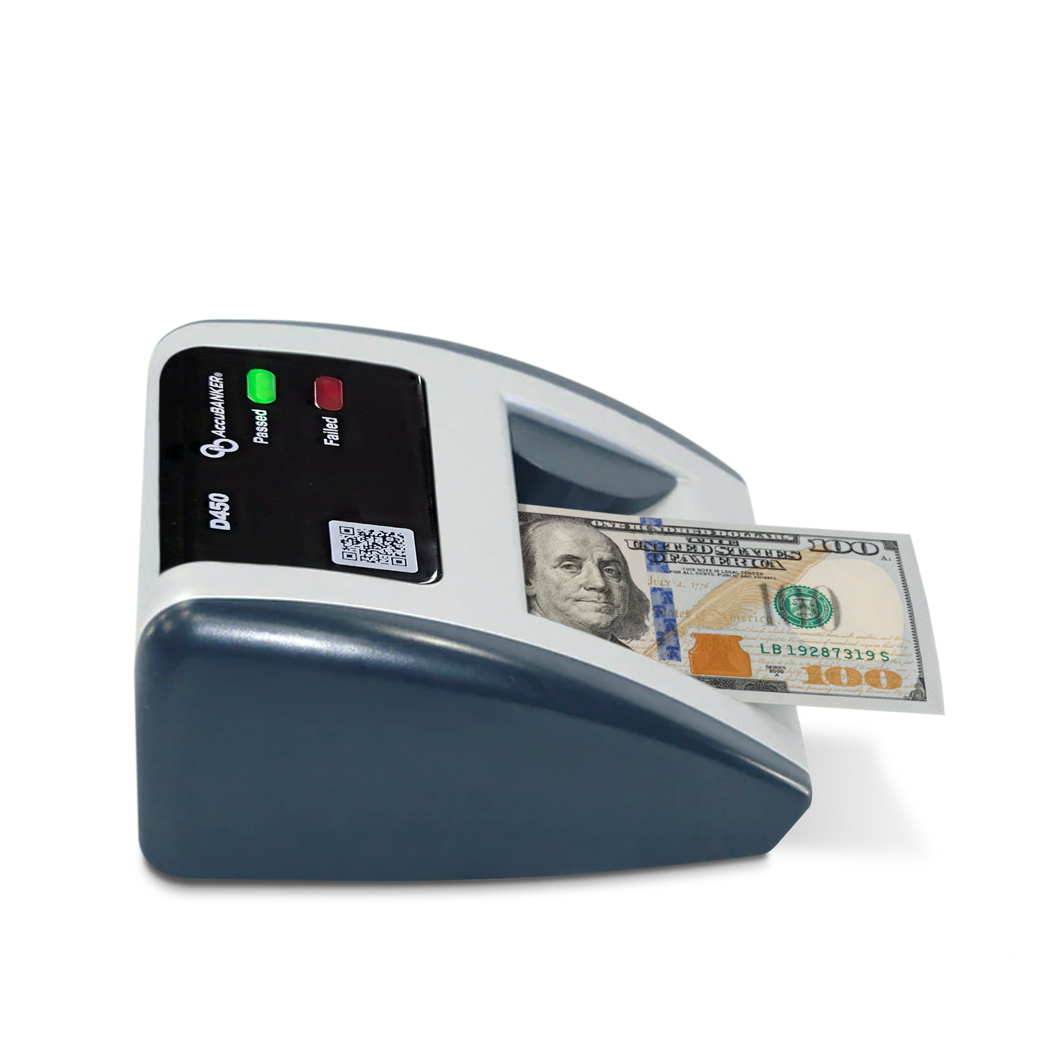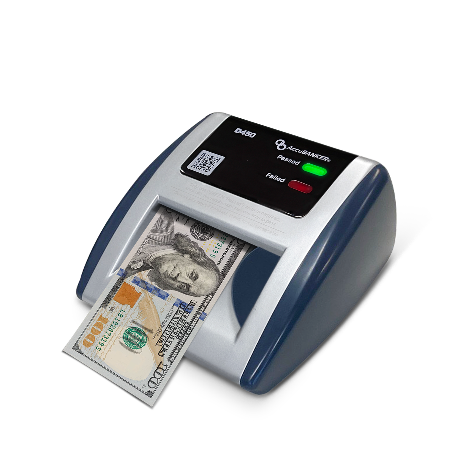 The D450 Counterfeit Bill Scanner's self-feeding detection system eliminates the need to visually inspect suspicious notes. Great for bars, nightclubs, restaurants, movie theaters, gas stations, retail stores, and all other businesses where cash transactions take place. This automatic counterfeit detector checks for authenticity using five counterfeit detection systems in less than 1 second per bill. Audible and visual warnings notify the user if the bill passed or failed the test. Its compact and lightweight design makes it easy to fit anywhere. Use the D450 to protect your business against counterfeits that negatively affect your bottom line.