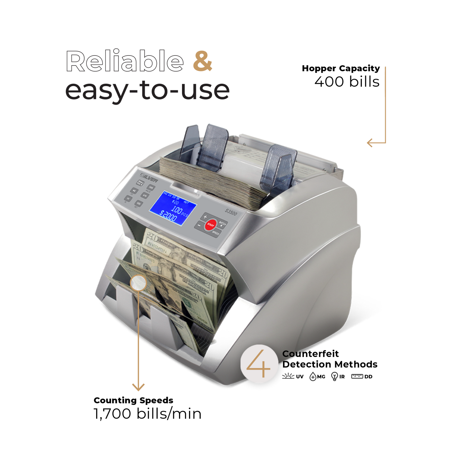 Flexible and efficient, the S3500 High Speed Bill Counter MGUV is a great money counting machine for organizing and adding bills. With its convenient batch value function, you can add pre-sorted bills by denomination. The S3500 also comes with counterfeit detection and counting speeds of up to 1,700 to offer a combination of good protection and performance.